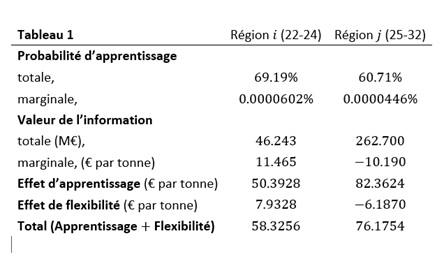 Ces mécanismes se reflètent dans la décomposition des effets totaux. L’effet d’apprentissage est quantitativement important dans les deux zones (environ 50 € par tonne à l’ouest et 82 € par tonne à l’est), mais il est partiellement compensé par l’effet de flexibilité, positif dans la zone occidentale et négatif dans la zone orientale. Au total, l’apprentissage actif accroît la valeur marginale de l’échappement (stock résiduel) de 58 € par tonne dans la zone occidentale et de 76 € par tonne dans la zone orientale, confirmant que l’information constitue un déterminant économique de premier ordre des décisions d’exploitation.